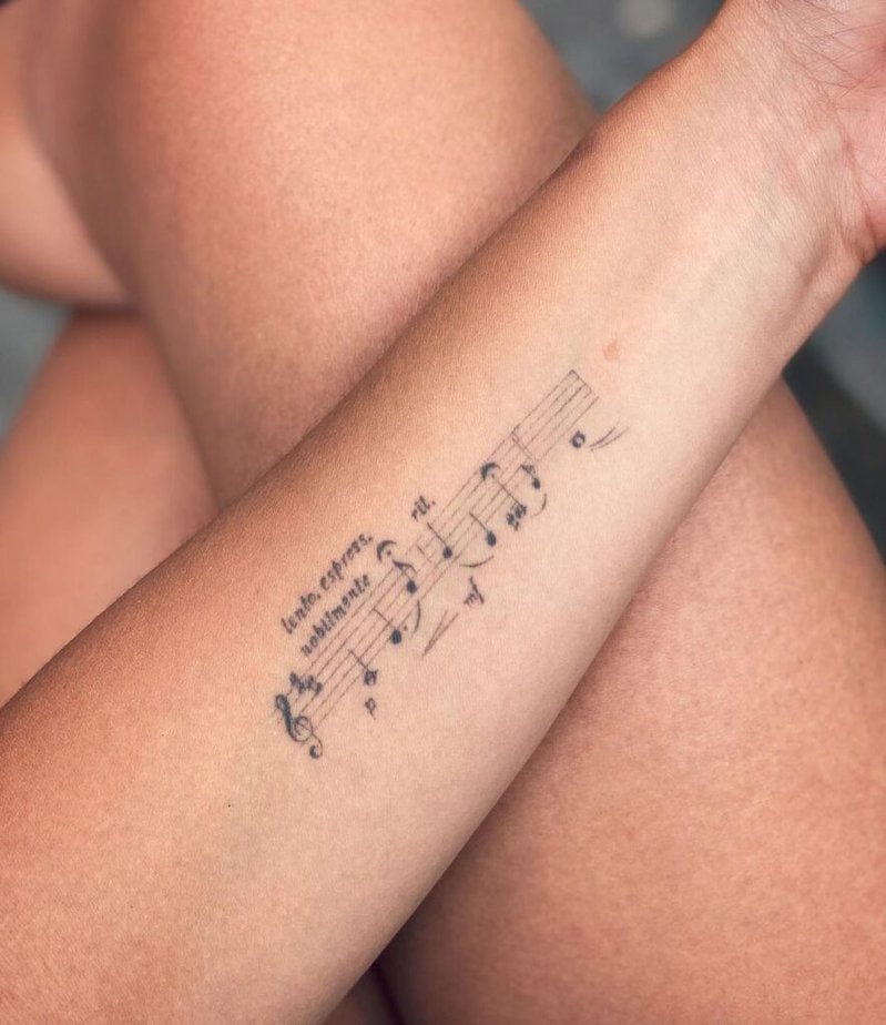 Putting sheet music on the inside of your arm feels kind of private and tender. It’s like holding your favorite melody close — visible when you want it to be, hidden when you don’t. Whether you’re new to tattoos or a seasoned collector, this spot is so rewarding.