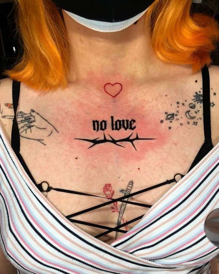 Even though you can really get tattooed anywhere, some spots just work better for certain looks. For “no love” pieces, the arm (including the hand) and the leg are pretty common picks, but you could also think about chest, neck, lower back, stomach, or that sneaky spot behind your ear. Those areas can be more painful, sure, but also kind of deliciously dramatic. My advice: imagine how the tattoo will look in that place, then be honest with how you feel about it — you might surprise yourself.