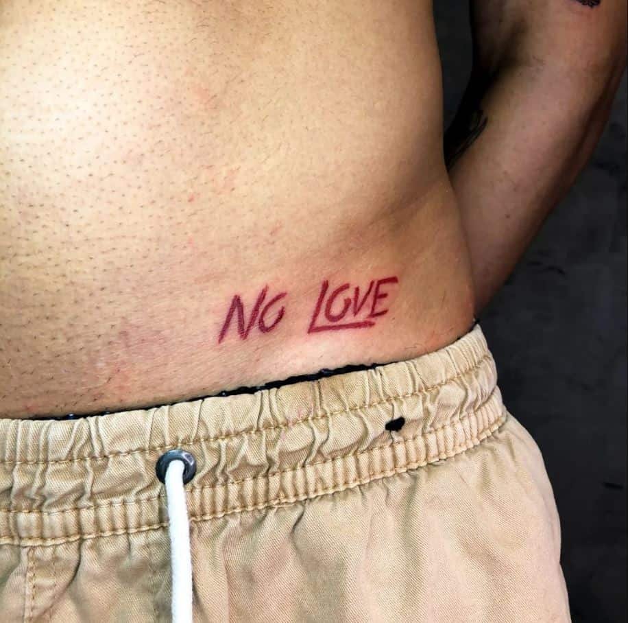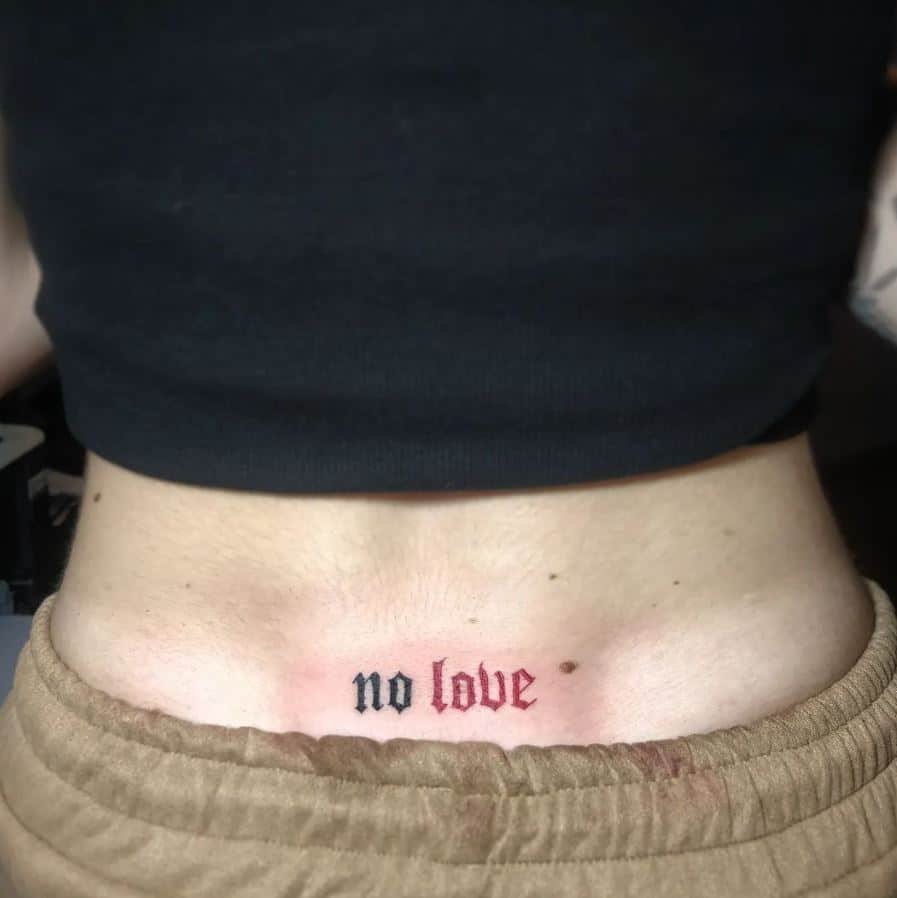 There’s something playfully defiant about a “no love” tattoo on the lower back. Use contrast — black and red inks look gorgeous there — and you’ve got a piece that steals the spotlight at the beach. It’s flirty but firm: I’m here, I’m healed (or healing), and I’ll show up on my own terms.