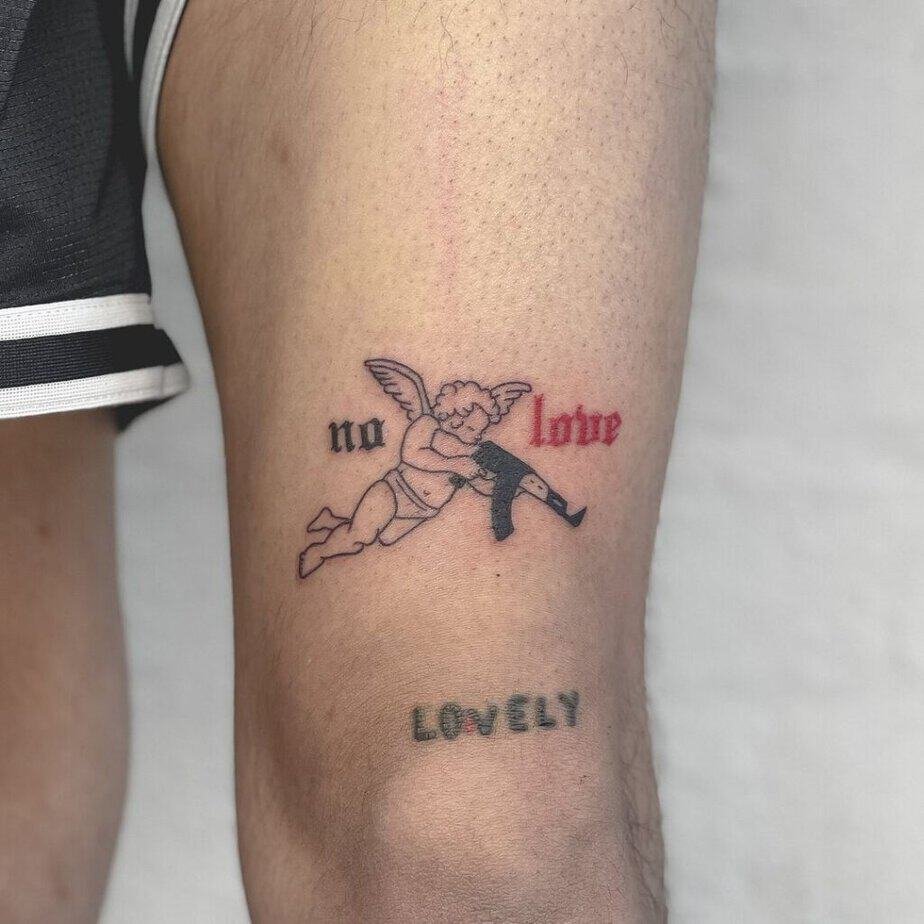 Leg tattoos are fun because they can be cheeky or full-on dramatic. Imagine a baby angel holding a gun with “no love” wrapped around it — surreal and unforgettable. Bold graphic letters down the shin are simple but arresting, and slightly different takes on the same font can make it feel totally unique.