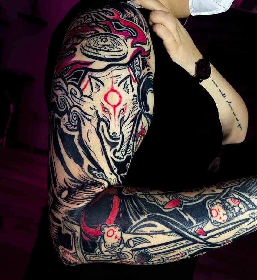 Thinking of committing to something that makes a statement? A full-sleeve lets the artist weave Okami into a landscape of detail — mostly black and red, high contrast, very dramatic. It’s perfect if you want your skin to tell a story across hours and sessions: mythology, battle, restoration, all in layered imagery. Big, beautiful, and meaningful.
