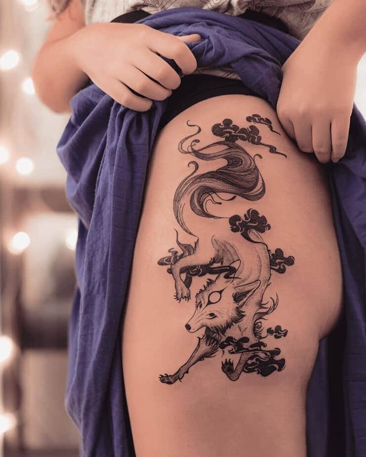 For a feminine and elegant placement, this black-and-gray hip tattoo is a beautiful pick. It carries Amaterasu’s essence without shouting, so it feels personal and empowering — a little secret armor you wear.