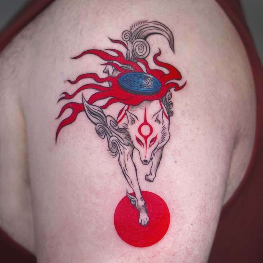 This shoulder tattoo blends classic black-and-gray tones with punches of red — think a glowing Celestial Brush above the wolf and a sun that’s basically radiating purpose. The red elements are clever: they pull focus to her divinity and the idea that she’s actively restoring the world. It’s bold without being over the top, and the placement makes it feel quietly confident.