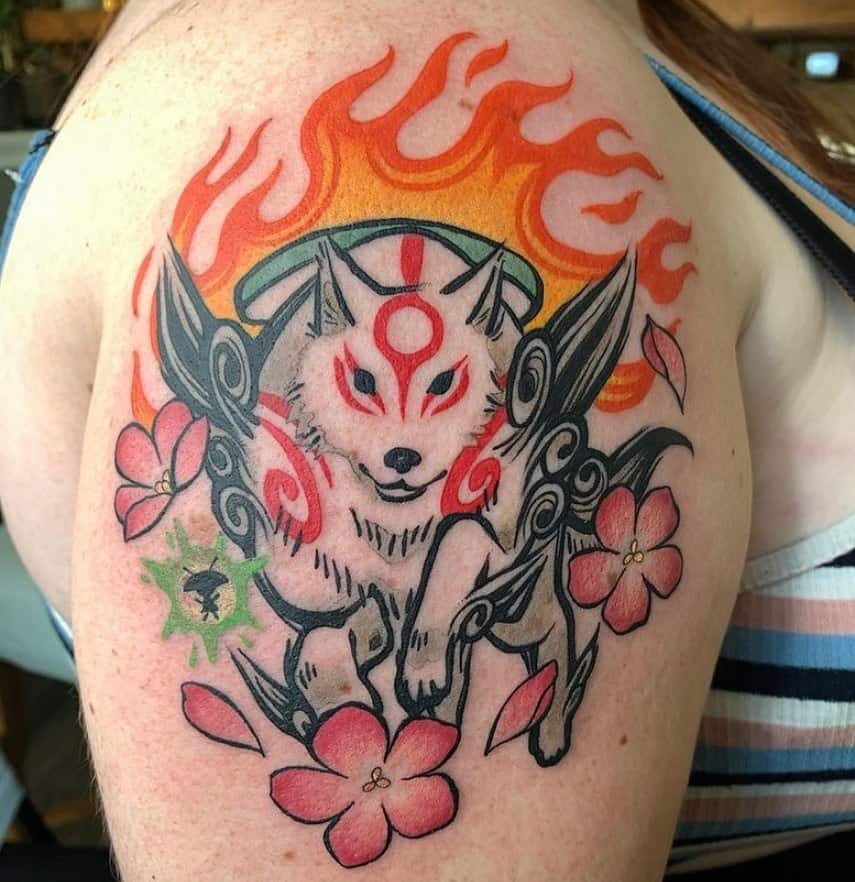 If you and a partner want something sweet but powerful, matching Okami tattoos are a lovely idea. These have the classic wolf colors plus green accents around the legs to show a bond with nature, and a soft pink flower to add a gentle charm. It’s symbolic of shared values — protection, healing, that kind of thing — without being sappy.