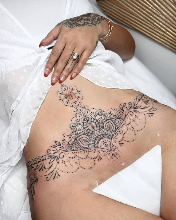 Stomach tattoos are perfect when you’re ready to go big. They’re especially popular for covering surgical or C-section scars, but honestly they just look stunning there — flowing ornaments can accentuate curves in a really beautiful way.