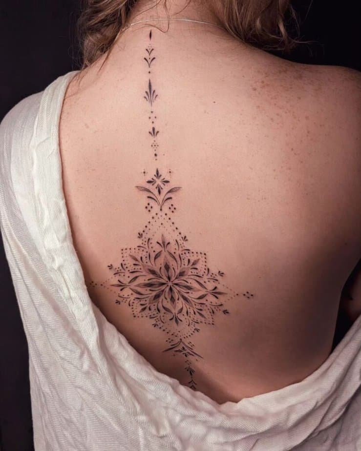 Spine tattoos can be challenging, sure, but they’re also incredibly graceful. A column of ornaments down your spine reads like a piece of jewelry — it’s sleek, elongating, and has a quiet confidence to it.