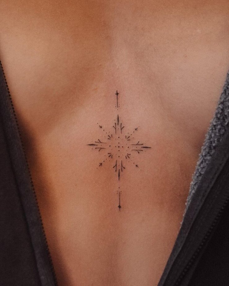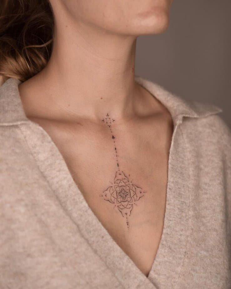 Sternum tattoos often lend themselves to ornamental work — they’re flirty and a bit intimate. Whether you want subtle curves or an elaborate centerpiece, ornamental sternum tattoos age into something really striking.