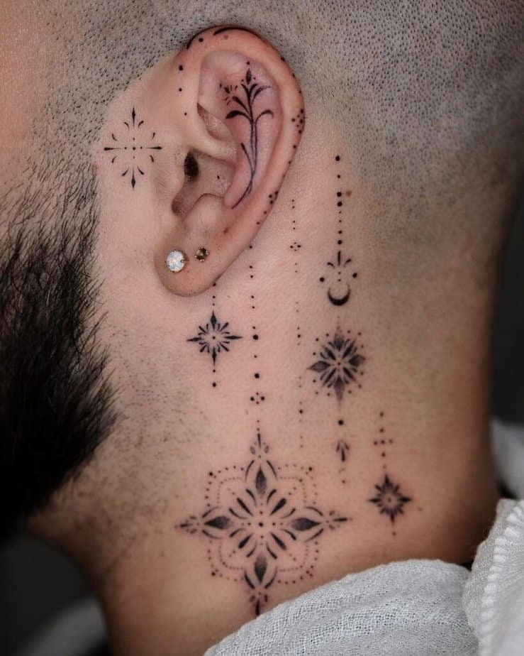Behind-the-ear tattoos are tiny little secrets — not as show-stopping as a back piece, but they’re perfect for an intimate ornament. Work with your artist to craft a shape that feels like a personal accent rather than a trend.