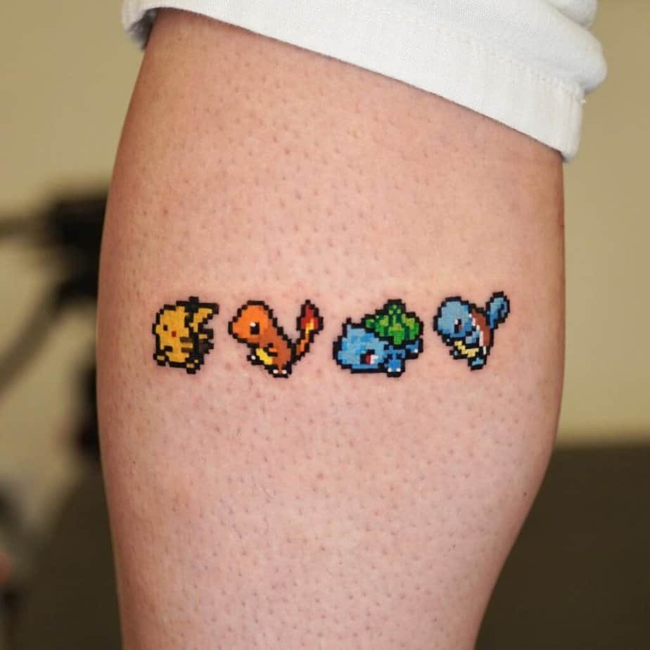 If you were always the trainer who wanted a whole squad, these multi-Pokémon pieces are for you. There are water-only compositions that feel cohesive because the blues and tiny color accents tie everything together, and bigger group tattoos that include Ash at the top so it reads like a little scene. The key here is composition: a great artist will arrange each Pokémon so they don’t fight for space — everyone gets a moment to shine. Pixel-style tattoos are also making a comeback; tiny, nostalgic sprites can be surprisingly detailed if kept small, or blown up into chunkier, game-like pieces that still feel delightfully retro. Basically: you can absolutely celebrate an entire team instead of choosing just one.