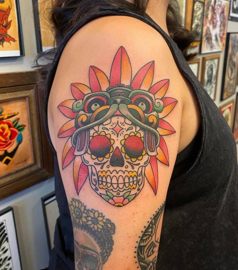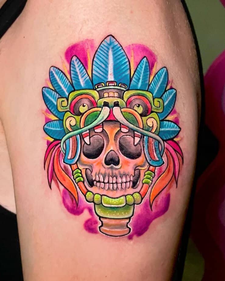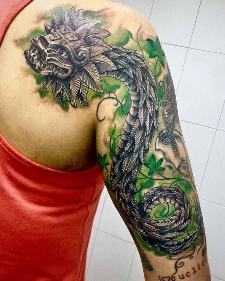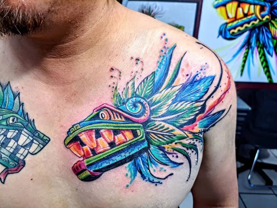Pairing Quetzalcoatl on the chest in natural hues makes a bold statement. It’s for folks who want something big and meaningful — a reminder to stay connected to the elements, to the world, and to your own courage. Tempting, right?