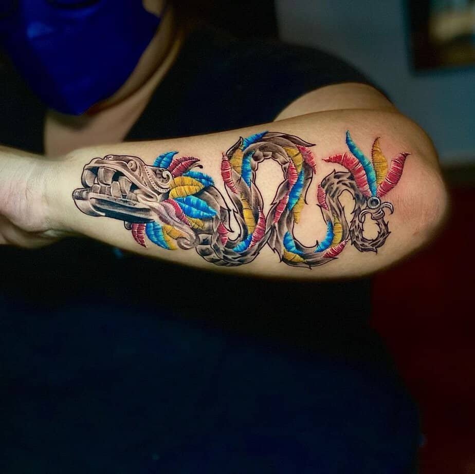 A bright, colorful Quetzalcoatl for your forearm