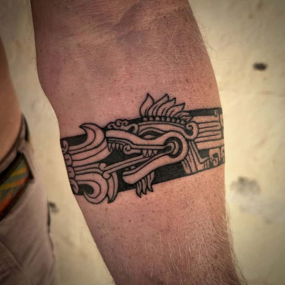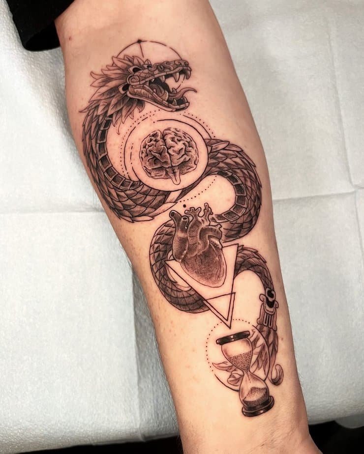 This forearm design leans darker, with intricate linework that captures Quetzalcoatl’s wisdom and strength. It’s a subtle way to wear cultural heritage and personal growth — always visible, always a gentle nudge.