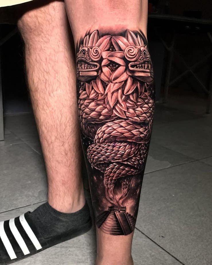 This dramatic knee-to-shin blackwork shows Quetzalcoatl emerging from a Teotihuacan pyramid. It reads like a bridge between the earthly and the divine — perfect if you want a tattoo that feels sacred and monumental.