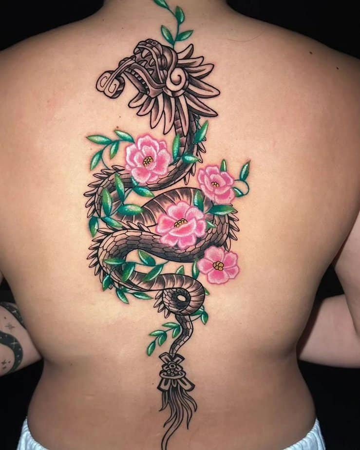 Black-and-gray Quetzalcoatl tangled in pink blossoms is such a lovely contrast. It leans into themes of compassion and growth, like a reminder to nurture both your heart and your journey.