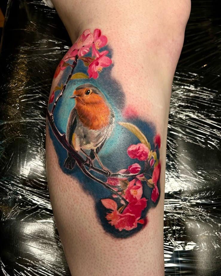 This one looks like a little painting on your skin — bold brush-like colors and a robin resting on a flowering branch. It’s a lovely pick for someone craving creativity and a reminder of spring’s fresh starts.