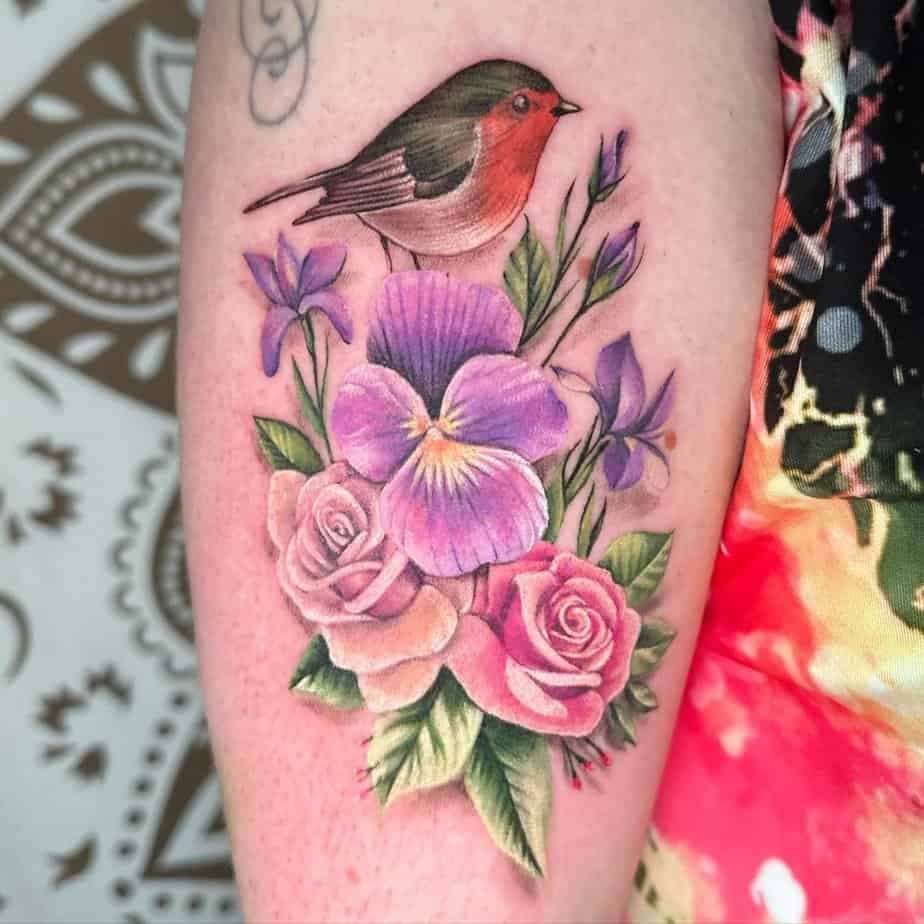Robins plus roses is full-on romantic energy — purple and pink roses add elegance, and the whole design says, "I care, deeply." It’s a beautiful option if you want a tattoo that looks like a gift to someone you love or a reminder of deep affection.