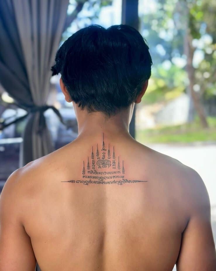 Okay, picture a bold geometric diamond resting on the back of your neck, and then imagine the five sacred lines of Hah Taew streaming down your shoulder blade. It’s this cool mashup of modern edge and classic tradition. The diamond brings a sharp, contemporary vibe while each of those five lines carries its own blessing—protection, fortune, success—so it’s beauty and meaning in one tidy package.
