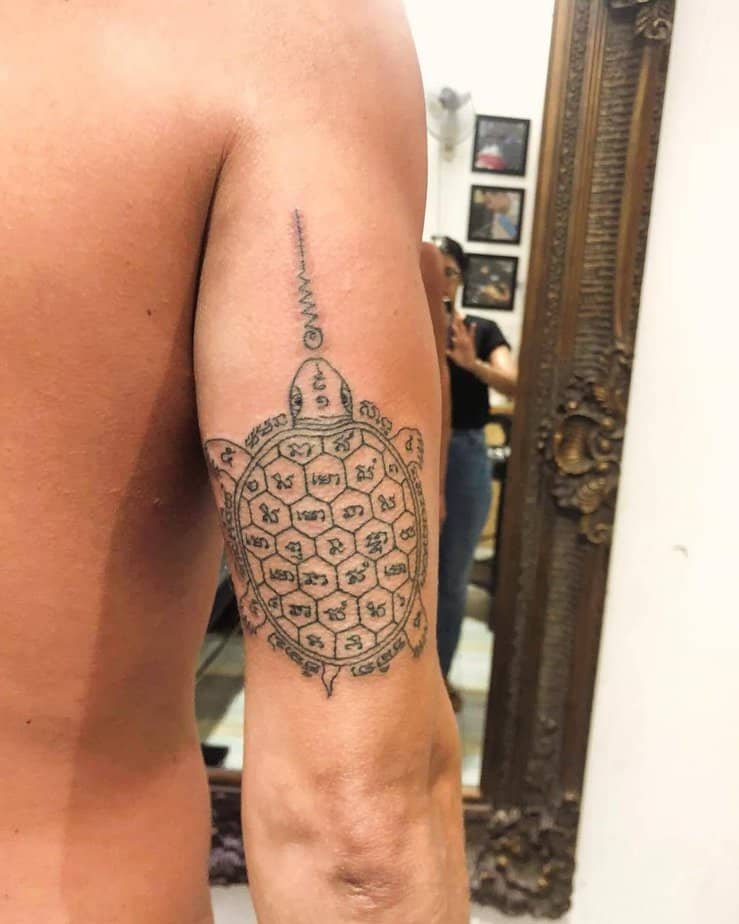 This centipede isn’t creepy—it’s a secret source of strength. Wrapped around the side, it’s like having a hidden superpower beneath your clothes. In sak yant tradition, the centipede stands for unstoppable energy and protection, which sounds pretty useful to me.