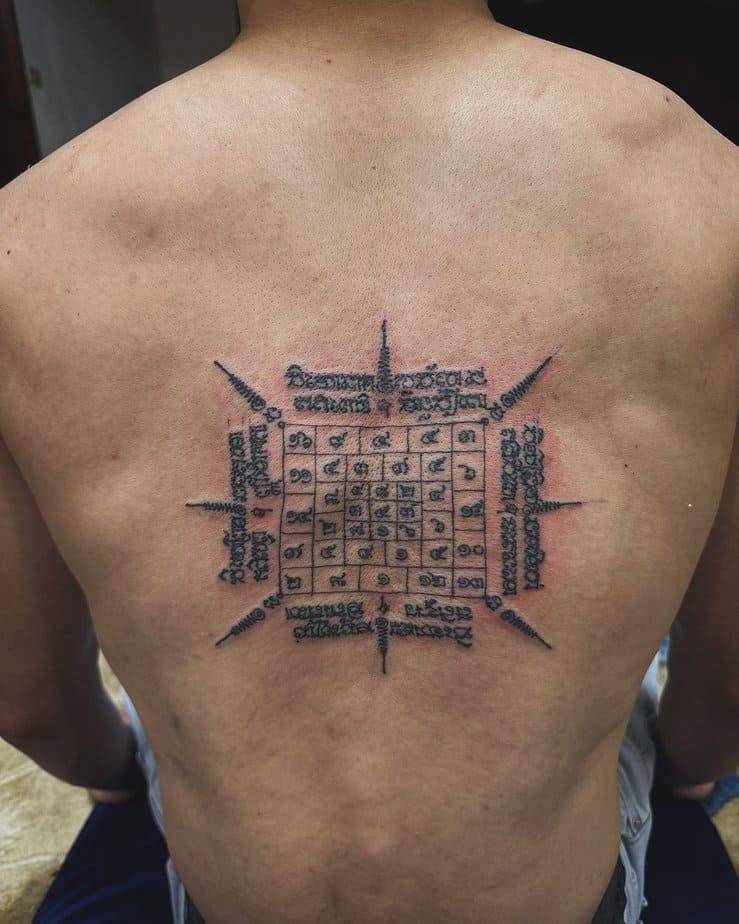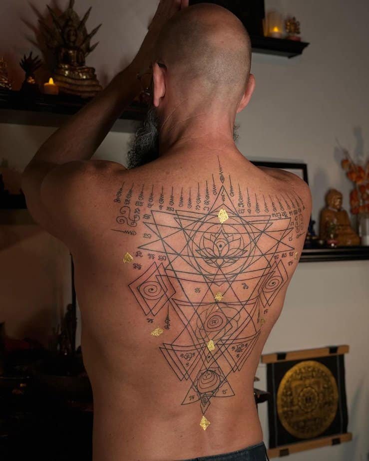 If alignment soothes you, this is the tattoo that gets it. Multiple yantras placed in perfect harmony across the back create a sense of order that’s visually gorgeous and spiritually stabilizing. It’s not just about aesthetics—each symbol brings its own blessing, so you get protection, success, and inner peace all arranged like a little map to feeling steady.