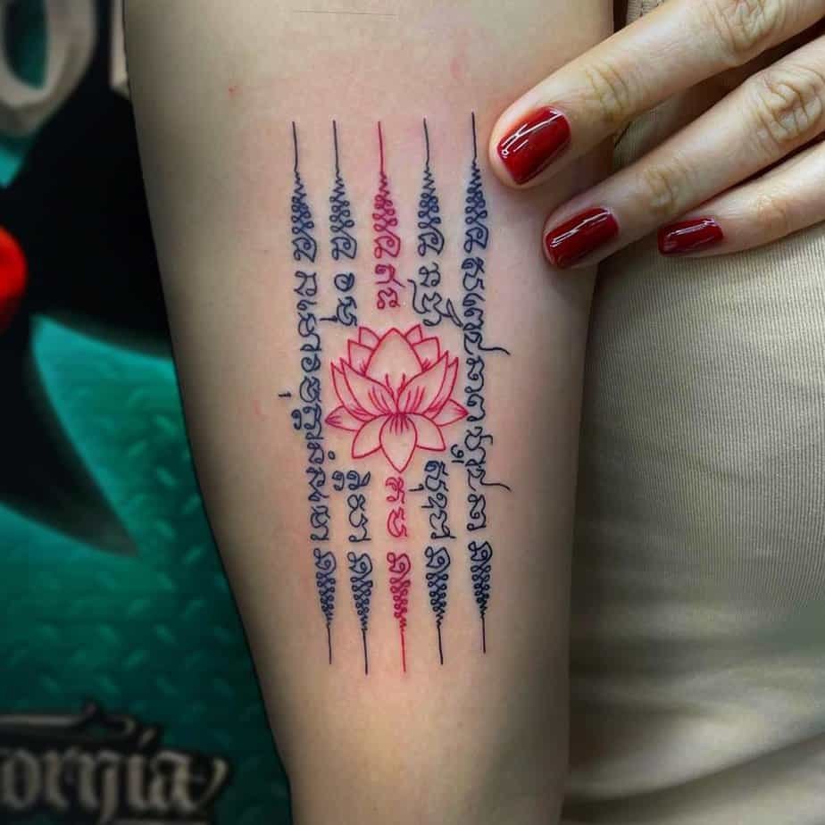 Here’s a softer one: the Hah Taew’s five lines framed by a delicate pink lotus in the center. The lotus brings purity and enlightenment to the powerful protection of the lines, so it’s perfect for someone balancing inner growth with outer strength. It’s beauty and meaning intertwined.