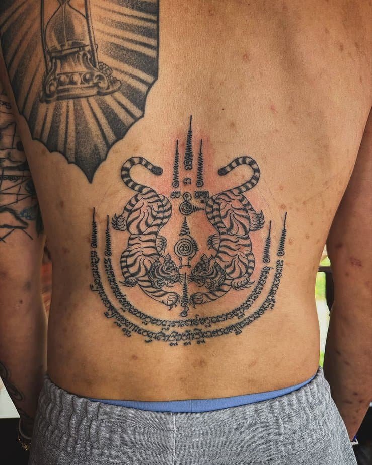 Few combos feel more iconic in sak yant lore than tigers guarding a sacred yantra. The tigers add raw energy while the yantra provides spiritual structure—together they balance fierce protection with steady blessings. It’s one of those timeless duos.