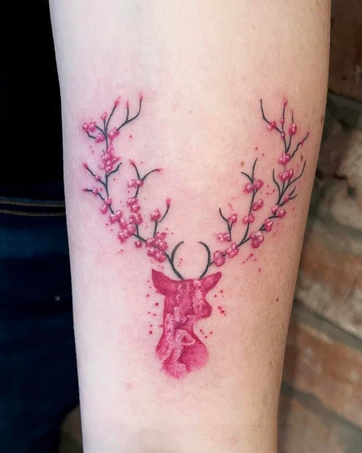 A stag with cherry blossoms in its antlers is unexpectedly tender. The pink hues add softness to the stag’s natural grace, balancing elegance with strength. It’s a lovely fusion of tradition and delicate artistry.