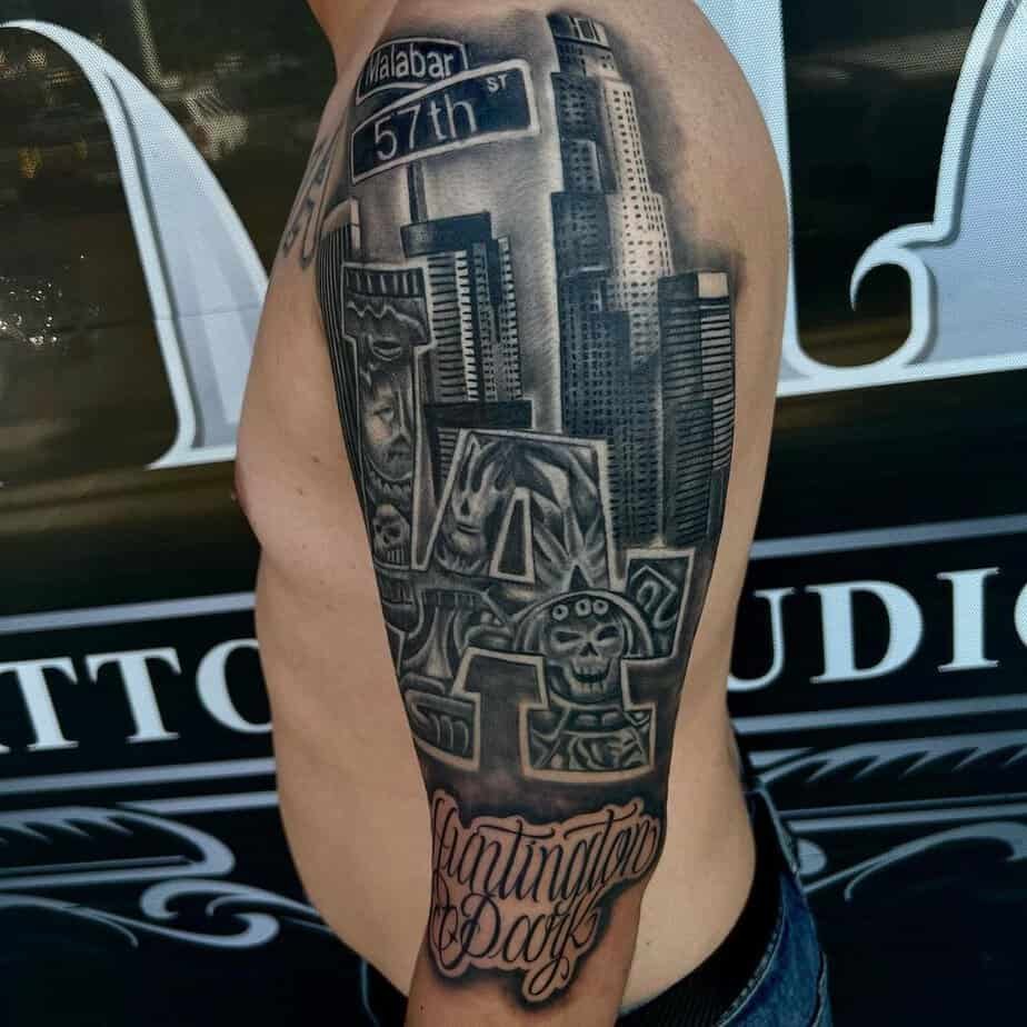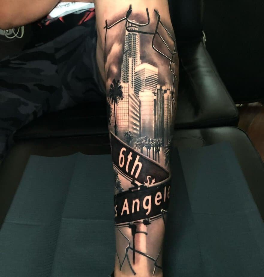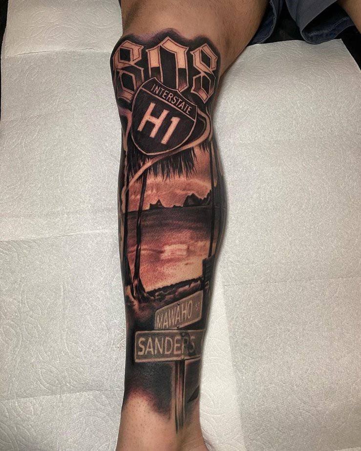 Not every street tattoo needs skyscrapers. A seascape with a palm tree and a sunset can say “home” loud and clear. If the ocean shaped you, put it where you’ll see it.