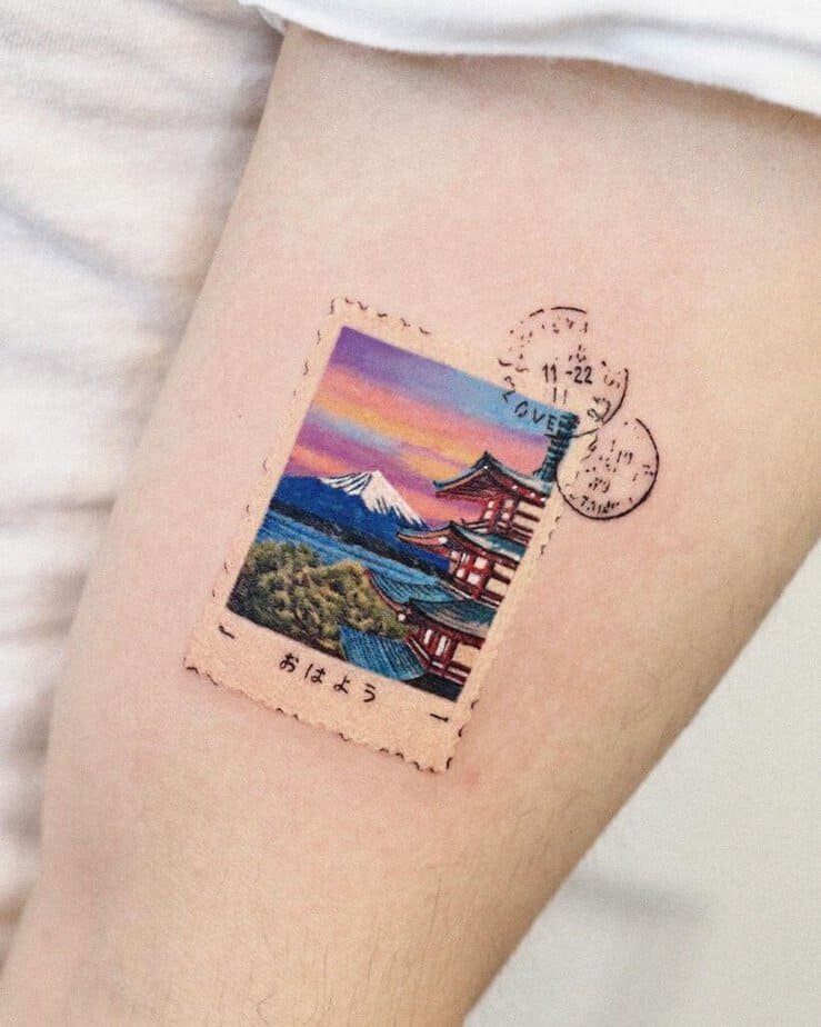 If you adore Japanese aesthetics and the way nature and architecture sit together in harmony, this postcard-style tattoo captures that delicate balance.