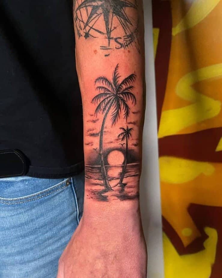 A black-and-gray palm-framed sunset shows you don’t need color to convey warmth. The shading gives it depth and mood — very elegant.