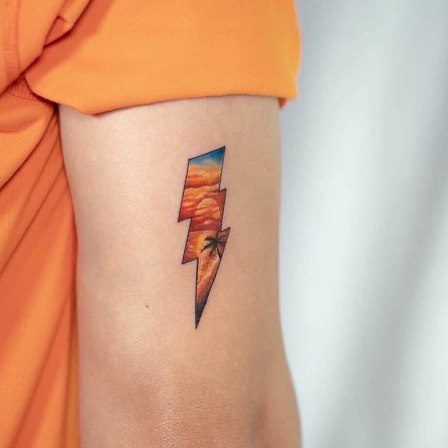 A colorful sunset inside a lightning bolt? Minimalistic but with a spark. If you like a little edge with your nature, this one’s fun and fresh.
