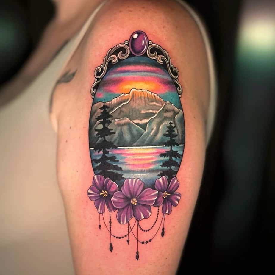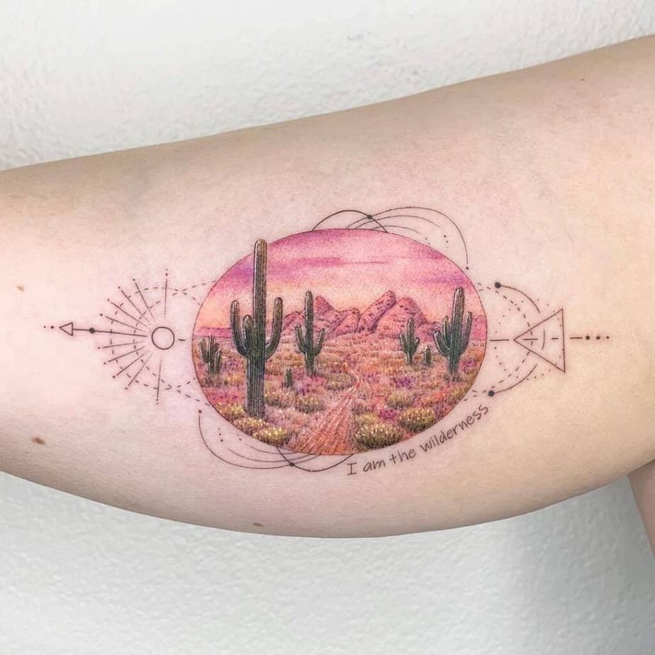 If you love traditional tattoo vibes, this globe-framed sunset is cheerful and colorful. It looks like a little badge of sun-soaked joy.