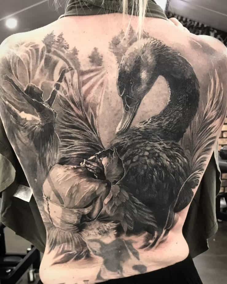 This one’s bold: a black swan stretching from shoulder to back, even upside down for extra intrigue. It’s theatrical and striking — perfect if you love dramatic, statement-making ink.