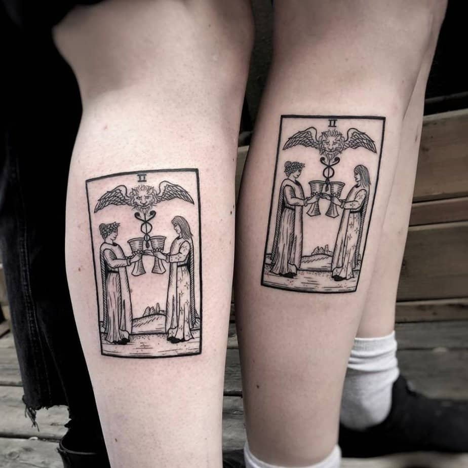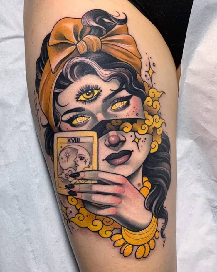 This one pops with color and detail — reds, yellows, little symbols everywhere. The Magician is about willpower and manifestation, so the tattoo feels like shrugging on a cloak of intention. If you believe in creating your own reality, this is a sweet, bold way to say so.