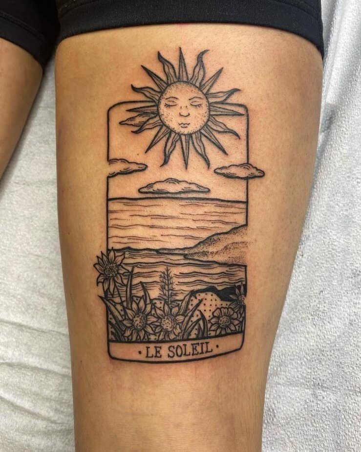 This sun tattoo is pure glow energy — think sunshine, flowers, and even mushrooms for that earthy touch. It’s for people who chase joy, love nature, and want a daily reminder to bloom freely and keep looking for the bright side.