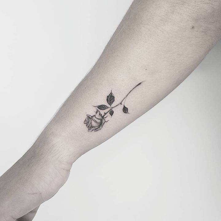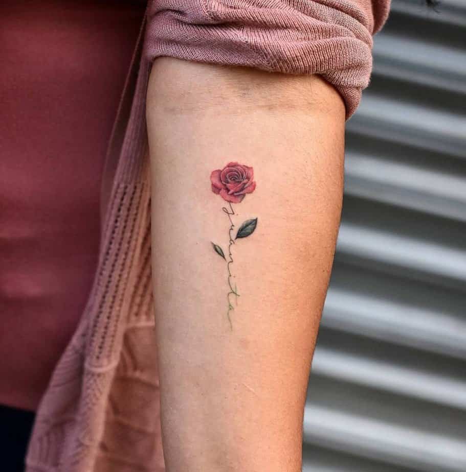 This one uses the stem to hold a name, turning the rose into a living dedication. It’s a tender way to honor someone — the tattoo becomes both symbol and signature. If you want a constant reminder of someone you love, this style does that in the sweetest way.