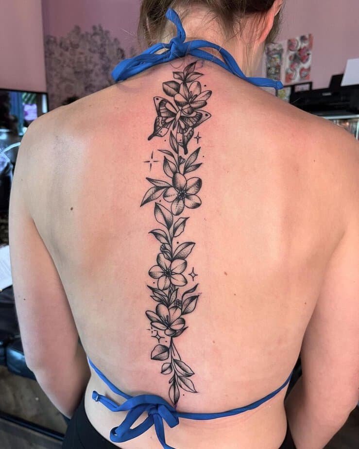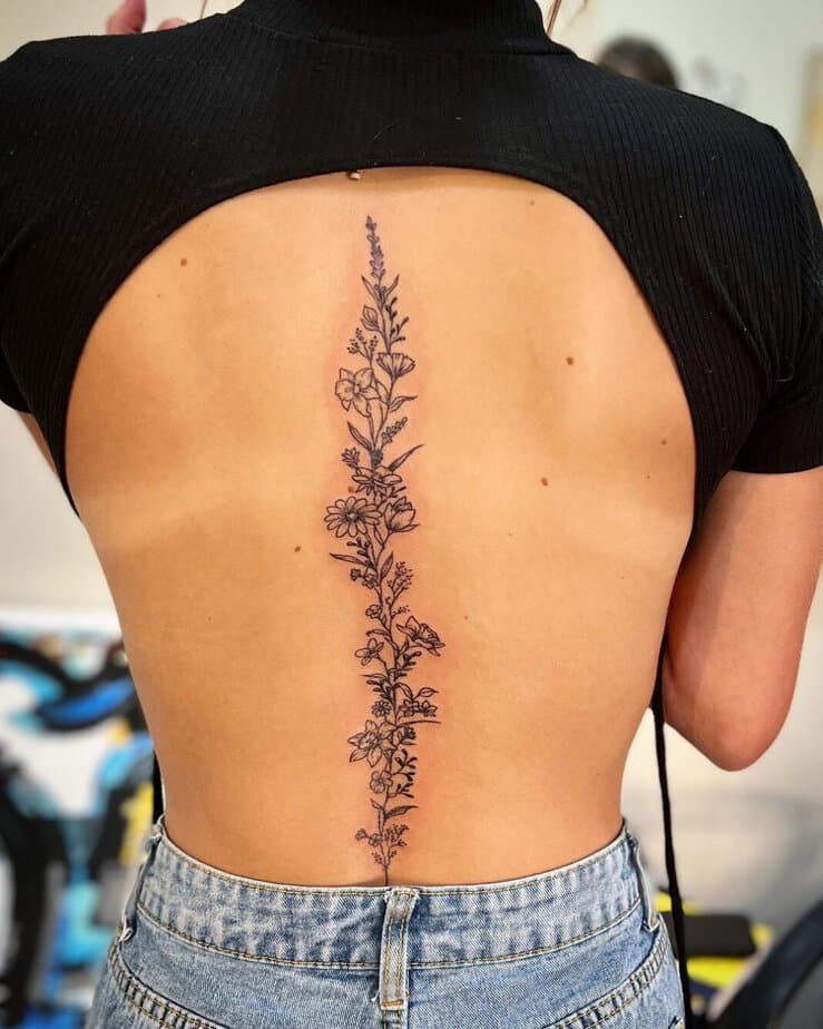 If you want something lush but not full-back coverage, floral vines are gorgeous. Picture vines creeping out from under petals — the vines often sit a touch darker so the flowers pop. You can go maximalist with several big blooms grouped together (without tattooing your whole back) or keep things dainty with lots of smaller, detailed flowers and visible vine lines behind them. Or, flip it: make the vine bold and thick so it’s the focal point and scatter smaller flowers around it. Either way, it feels like wearing a bouquet.