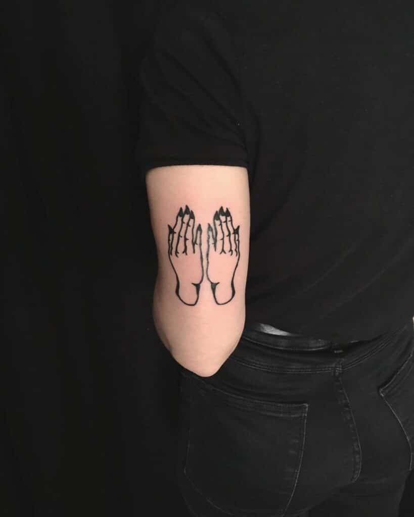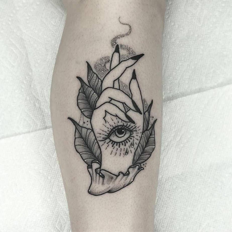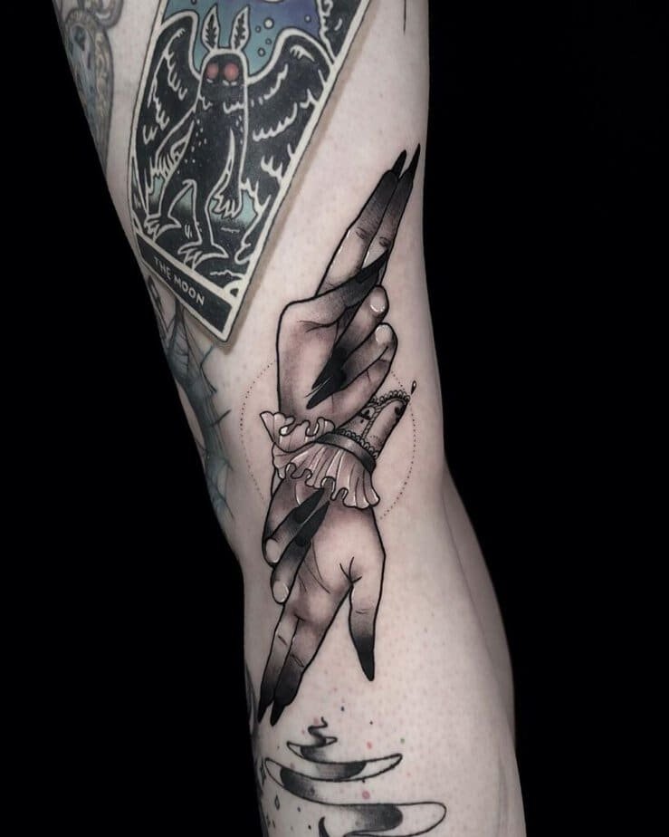 Not into a huge piece? Same here sometimes — simple linework can say so much. These designs strip everything back: single outlines, a suggestion of shadow, and those iconic long black nails. A snake wrapped around a finger can be the whole focal point while the hand itself stays understated, which I think feels very intentional. Or go extra minimal — a hand with solid black nails is practically shorthand for witch energy at this point. Tiny symbolic details like a pentagram, a web, or a small star can hint at a deeper meaning without overcrowding the skin.