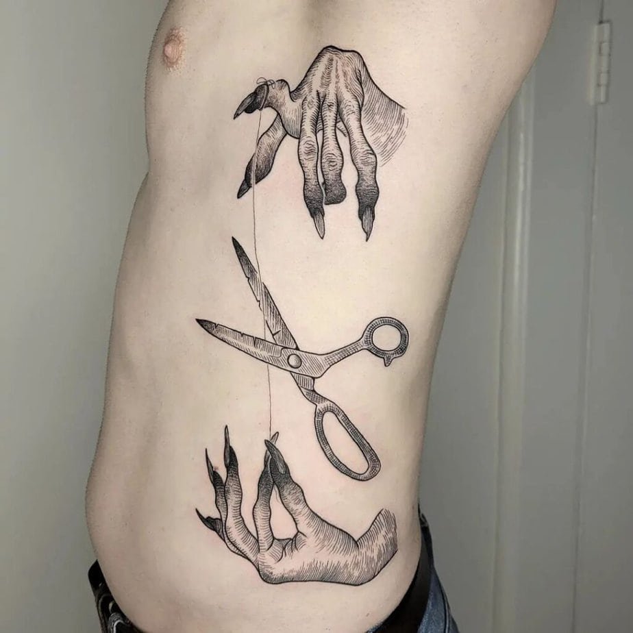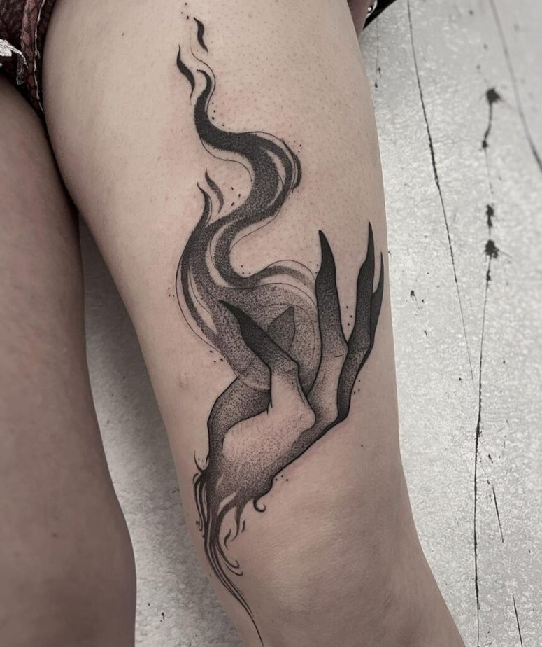 Okay, these are the ones that give me goosebumps in the best way. Think long black nails, chunky crystal rings, and fingers that look like they could actually cast something right now. Some designs go full gothic — blackened fingers, smoky dots for shadows, and tiny flames licking from fingertips — while others bring a snake or a familiar into the scene to emphasize that old-earth connection witches are famous for. I love the duality pieces too: hands reaching for the sun and the moon, or two hands pointing in different directions, because they feel like a quiet story about balance. There’s even a version where the hands hold a thread that’s about to be snipped by rusty scissors — bleak and poetic, and a cool way to show themes of life and death. If you want something that leans into the stereotype of witches working with darker forces, there are silhouettes bordering on devilish imagery. Or if you prefer the eerie to be more subtle, tiny moons, crystals, and plants tucked into the design give it all the witchiness without shouting it.